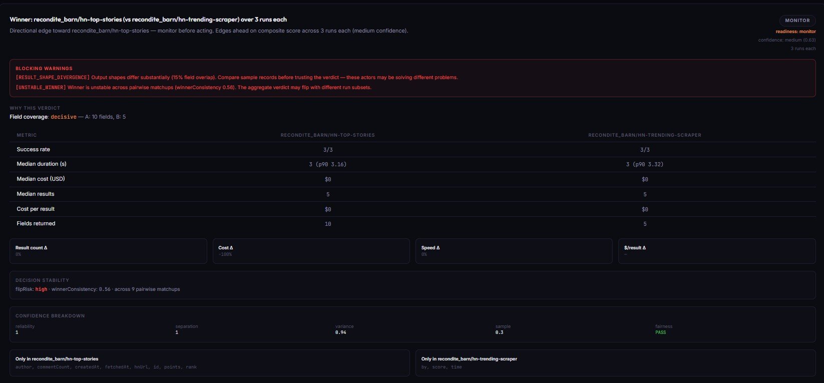 SUCCEEDEDas proof of correct data. Run-level monitoring only tells you the actor exited cleanly — nothing about whether the dataset is correct, complete, or structurally consistent. That's the gap Output Guard fills. - Single-run A/B comparisons. A/B Tester caps