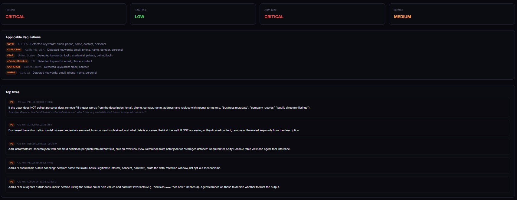 Actor Risk Triage scans an actor's metadata — name, description, categories, input/dataset schemas, README — for compliance and operational risk signals. PII keyword density, restricted-platform references, authentication-wall patterns, GDPR/CCPA/CFAA exposure, weak documentation.