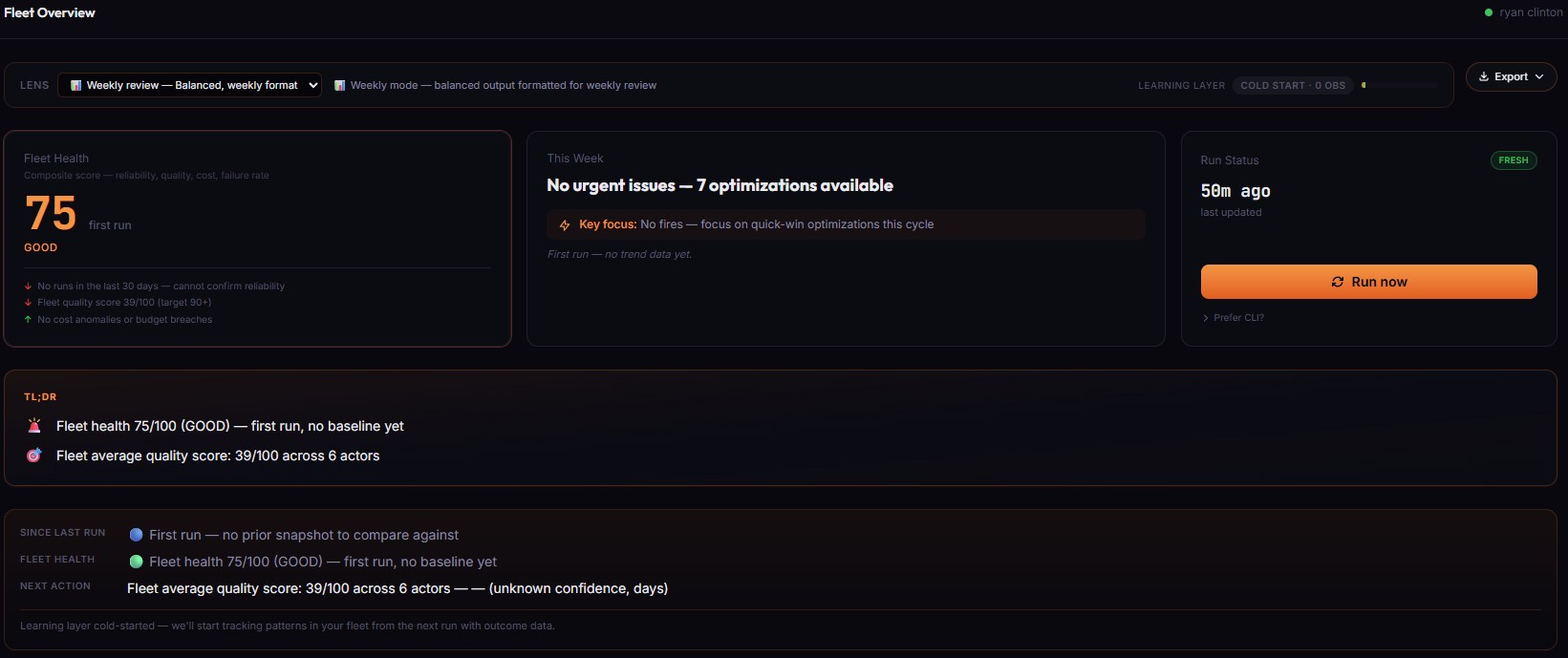 - Schedule the post-run actors weekly minimum. Output Guard, Quality Monitor, and Fleet Health Report all get more useful with run history.