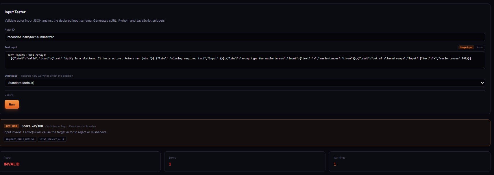 | Apify's native default-input test | Zero | Free | Binary UNDER_MAINTENANCE flag | Only crashes on {} | None |