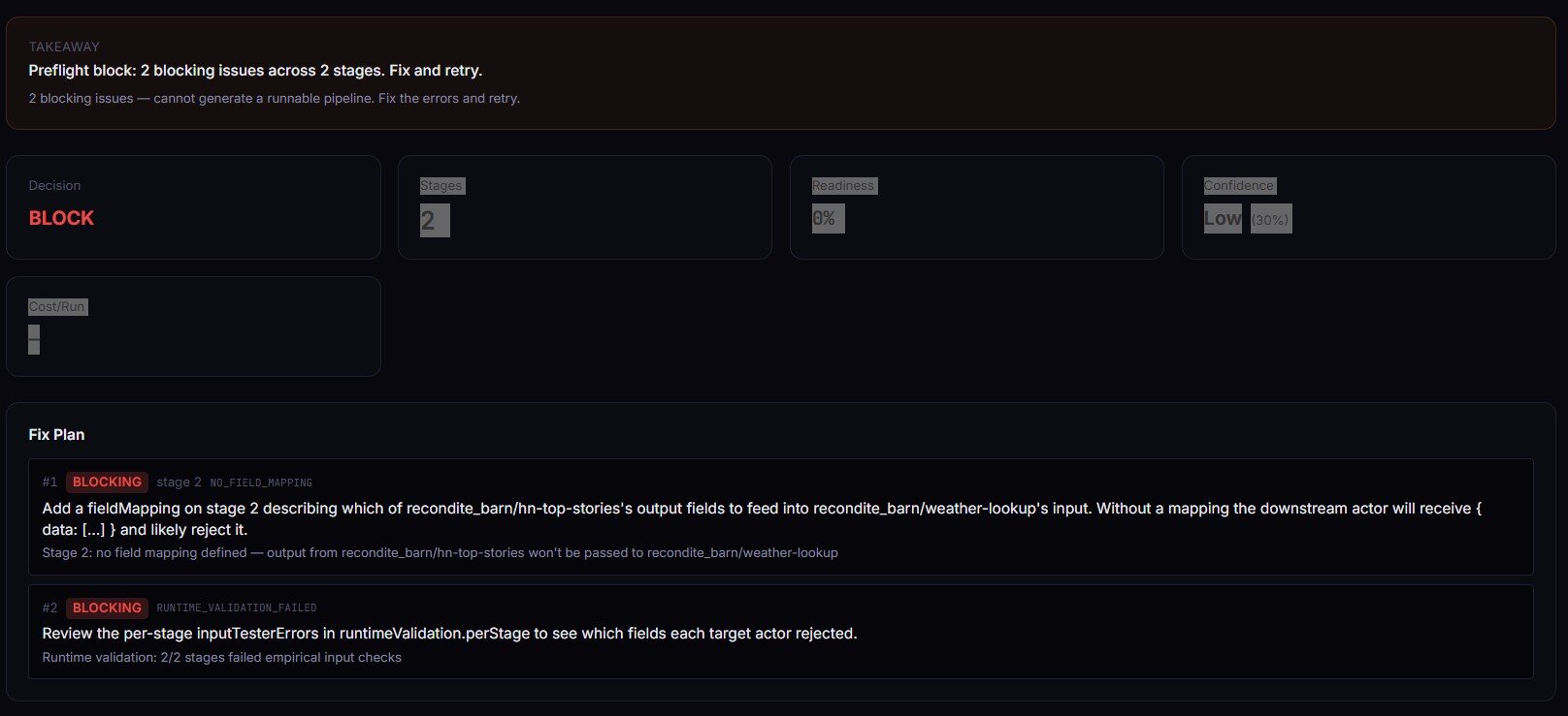 The most common pipeline failure is NO_FIELD_MAPPING — a non-first stage with no mapping defined, which means the downstream actor receives { data: [...] } instead of its declared input shape. Preflight catches that at design time in seconds instead of 4 minutes into the run. Set validateRuntime: true and it calls Input Guard on each stage with synthesized inputs — schemas line up on paper AND empirical input contracts hold.