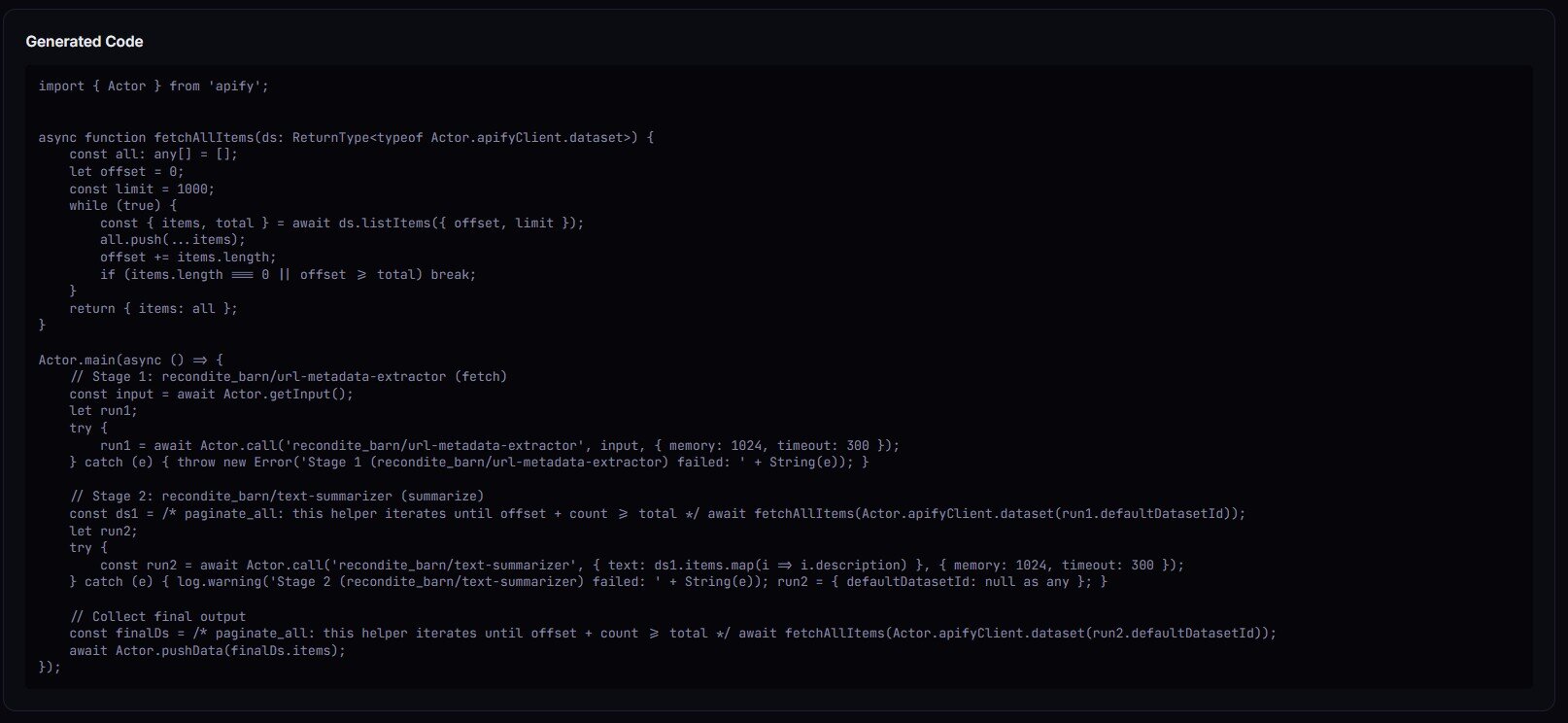 When the verdict is ship_pipeline or canary_recommended, you get the full TypeScript orchestrator in generatedCode — Actor.main(), Actor.call() per stage, dataset paging, field-mapping projections.