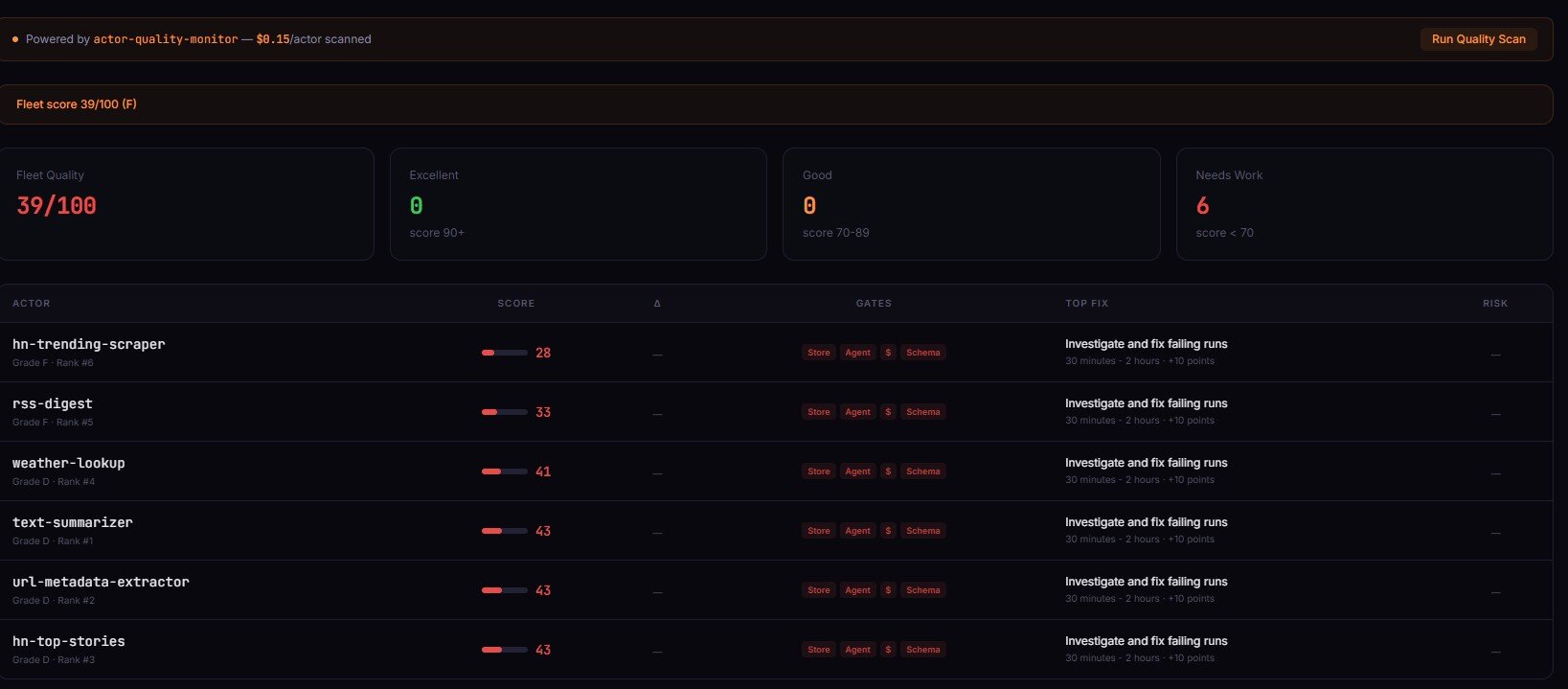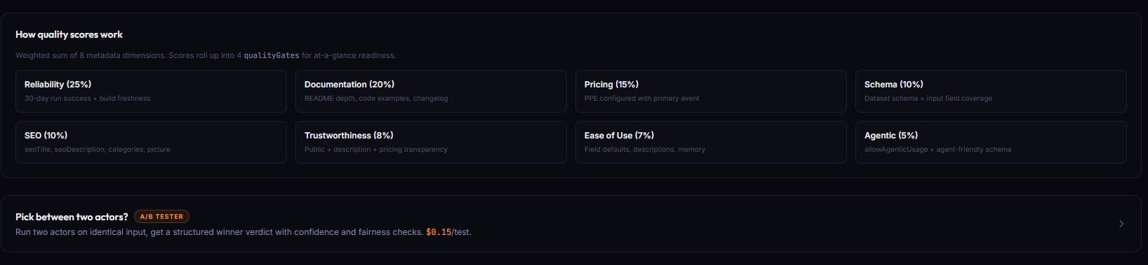 | Quality Monitor | Your actor scores below the Store-visibility threshold and you don't know — traffic stays low for the wrong reason |