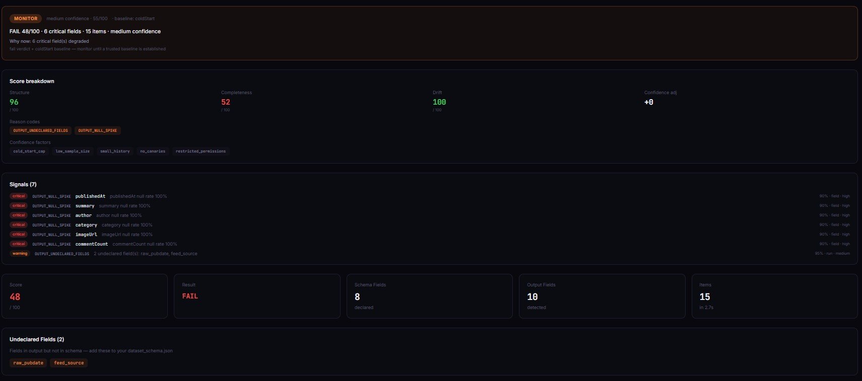 One of my contact-extraction actors started returning email null at 61% one Tuesday morning. Apify status: SUCCEEDED. Dataset: full of rows. Daily run finished in normal time, no errors logged. Downstream CRM received leads with no email for ~14 hours before anyone noticed. Before this, I had no way to detect it.