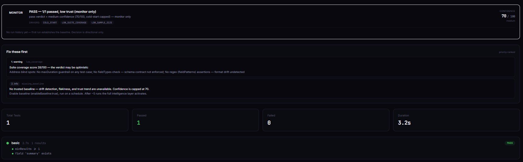 Your automation never has to parse prose. No regex on summary strings. No sentiment analysis on decisionReason. Read one field, branch, done. That's what makes these actors safe inside CI pipelines, Slack routers, MCP agent loops, and webhooks. The contract is enforced in code — Deploy Guard will never return act_now without a trusted baseline; Pipeline Preflight will never return ship_pipeline while a blocking issue is present.